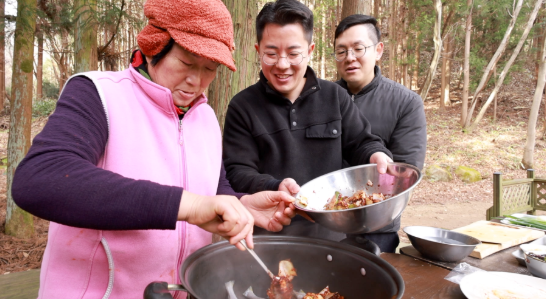 추운 날씨 속 김장 작업이 이어지면 중간중간 힘을 북돋아 줄 새참이 준비됩니다. 주엽 씨는 특별한 돼지고기 수육을 만듭니다. 흑미를 넣어 빛깔을 내고, 편백나무 향을 입혀 그윽한 풍미를 더한 수육은 단순한 음식이 아닌 정성과 감사의 상징입니다. 이 새참 덕분에 김장 작업의 고단함도 녹아내리고, 한결 더 힘을 내어 김장을 이어갑니다.