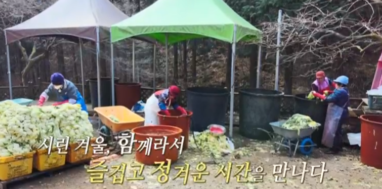 마을을 둘러싼 편백숲과 그 안에 자리한 식당은 마을 최고의 자랑거리입니다. 마을 사람들 역시 이 자랑거리를 지키고 돕는 데 적극적입니다. 이번에도 2천 포기 배추로 김장을 해야 한다는 소식에 마을의 '김장 선수'들이 하나둘 식당으로 모였습니다.