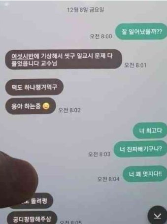 교수의 아내가 너무 화가 난 나머지 이들의 대화 내용을 공개 했는데 공개된 대화에는 학생이 "잘자 사랑해"라고 말하자, 교수는 "좋은 꿈 내 사랑. 행복하고 기분 좋은 꿈꾸길"이라고 인사를 나누고 다음날 오전 "잘 일어났냐"고 묻는 교수에게 여학생은 "여섯시반에 기상해서 씻고 일교시 문제 다 풀었어요 교수님. 도 하나 챙겨먹구 화장실에 갑니다"라고 말하기도 합니다