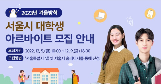 서울시는 이번 겨울 방학 동안 대학생 아르바이트를 모집한다고 5일 발표했습니다 지원자는 8일 오후 6시까지 '시 홈페이지'에서 접수할 수 있다고 합니다 요즘 같이 어려운 시기에 꿀알바라고 하는데요 자세한 내용은 홈페이지 등을 통해서 확인 할수 있습니다아래를 통해서 신청 하시기 바랍니다