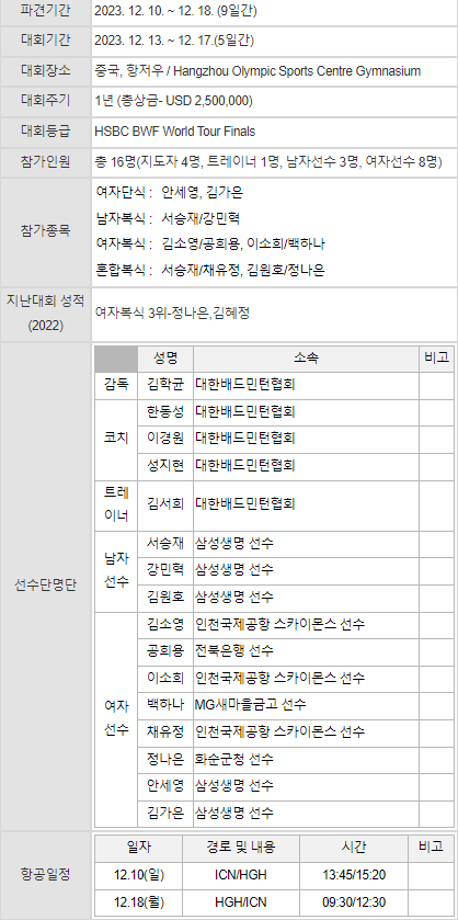 'HSBC 세계배드민턴연맹(BWF) 월드 투어 파이널스 2023'은 다음 달 13일부터 17일까지 중국 항저우에서 개최가 되고 있습니다 대회의 총상금은 250만 달러로, 이는 한화로 환산하면 32억2500만원에 해당합니다