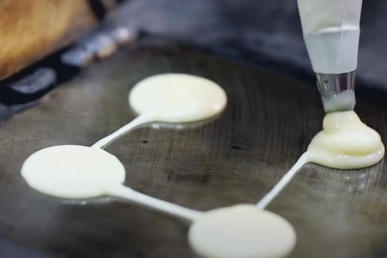 가게 안으로 들어가 보면 빨랫줄 같은 선에 짤주머니를 걸어놓고 손으로 직접 돌려가며 굽는 수동식 기계로 전병을 만드는 사장님이 계신다고 하는데