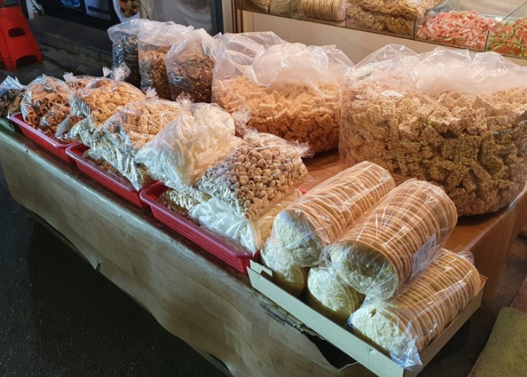 여기는 옷가게의 간판이 떠오르는데, 가게 앞에는 추억의 전병들이 나란히 늘어서 있어 호기심을 자아내는 곳입니다