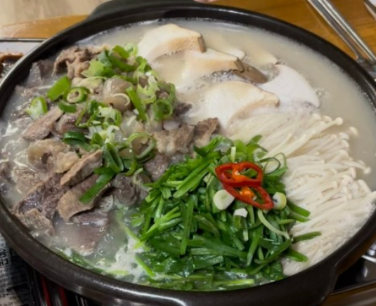 여기는 천년한우와 다른 지역 한우를 반반씩 섞어 육수를 끓여내는데, 이를 통해 풍부하고 깊은 맛을 창출합니다. 한우로 끓인 육수에는 두툼하게 썬 고기가 풍부하게 들어가 진한 곰탕을 완성합니다. 특히 고기를 크게 썰면 양이 늘어나게 마련이어서, 고기의 풍부한 육즙을 느낄 수 있습니다.