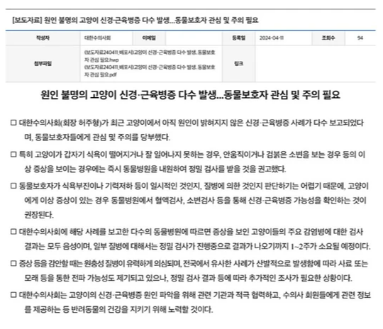 전국적으로 88건의 반려묘가 무기력증과 신경·근육병증으로 폐사한 사건이 보고됐습니다. 이들 고양이는 모두 같은 제조원이 만든 특정 사료를 섭취한 것으로 확인되었습니다. 동물보호단체 라이프에 따르면, 지난 20일 기준으로 접수된 피해 반려묘는 총 236마리이며, 이 중 88마리가 사망했습니다. 라이프의 심인섭 대표는 "사료 외에는 다른 공통점을 찾지 못했다"고 밝혔습니다. 본문의 정보를 확인하세요